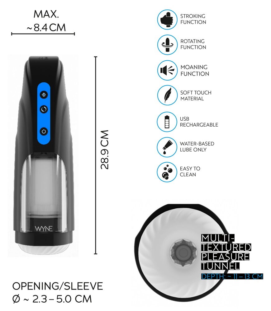 Leistungsstarker Masturbator 09 von WYNE, der den Penis in der sich Auf-und-Ab-bewegenden, aufregend rotierenden Innensleeve rundherum verwöhnt. Sexy gehauchtes Stöhnen per beiliegender Kopfhörer sorgt dabei für stimmungsvolle Untermalung. Einfach nur zurücklehnen und genießen!